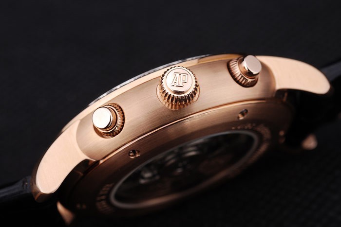 Crown : 18k rose vergulde cutwork kroon met Audemars Piguet logo en twee kleinere drukknop kronen aan weerszijden van it