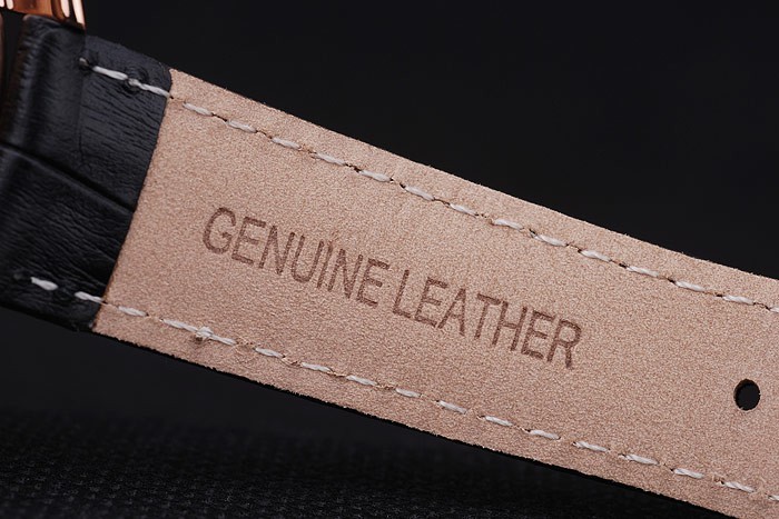 Bracelet: Black krokodil lederen band met witte draad stiksels en ge mbossed Audemars Piguet naam en logo en een Audemars Piguet ingeschreven 18k rose vergulde flip-over hook clasp