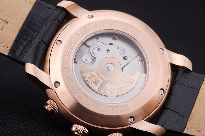 – Achterkant: roségoud vergulde vastgeschroefde achterkant met een mechanisch onthullend transparant centrum en inscriptie van ‘William Clinton 42ste president’