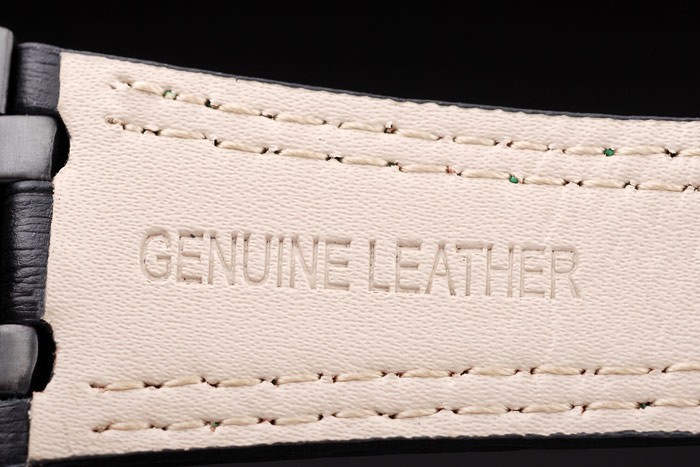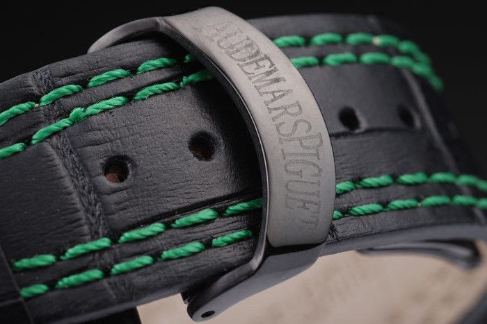 Bracelet: Heat embossed Audemars Piguet zwarte krokodillenleren band met dubbele stiksels en groen Audemars Piguet gegraveerde-ion-plated plooi-in clasp