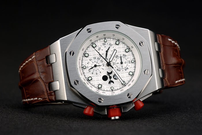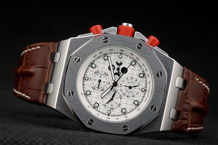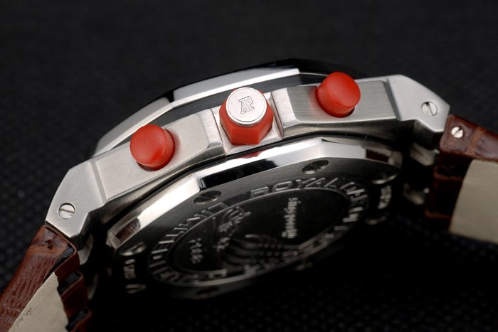 Crown: RVS Audemars Piguet logo gegraveerd rood email hexagonale kroon met twee kleine rode emaille drukknop kronen aan weerszijden van it