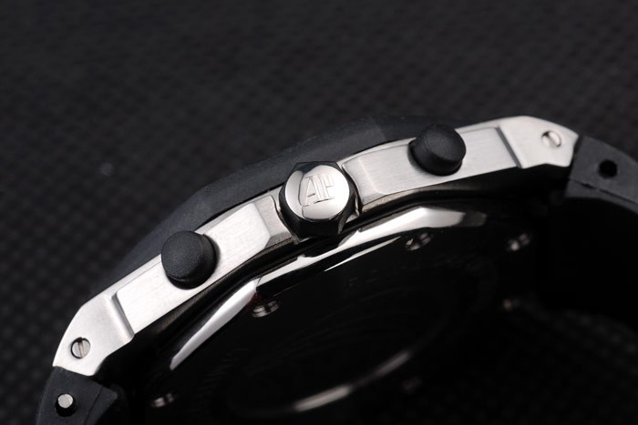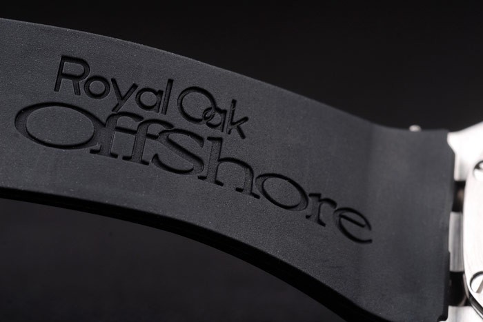 Bracelet: Audemars Piguet Royal Oak Offshore reli f zwarte rubberen band met Audemars Piguet gegraveerde gepolijst roestvrij staal vouw -in clasp