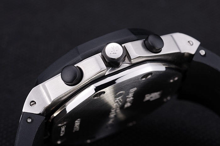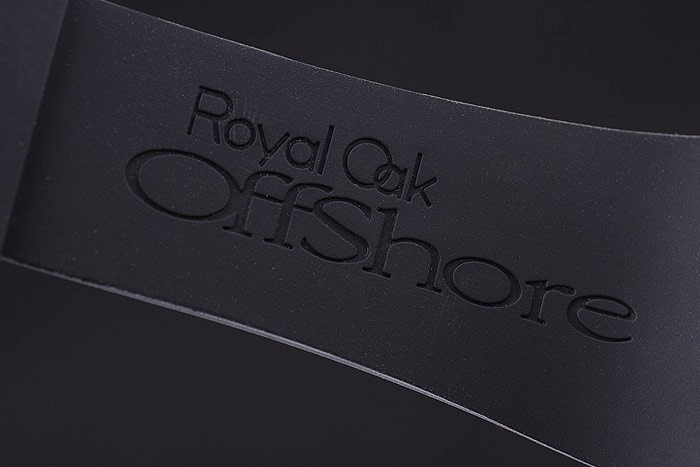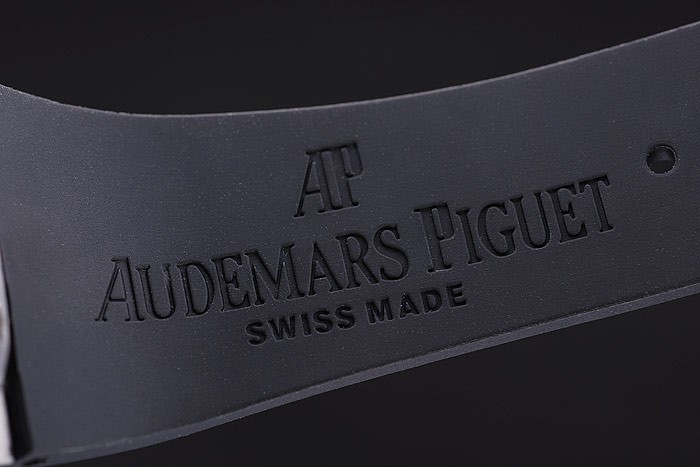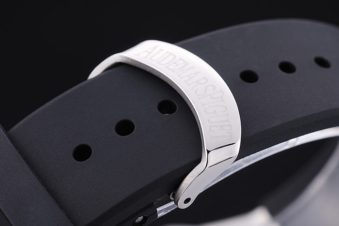 Bracelet: Zwarte rubberen band met warmte reli f Audemars Piguet Royal Oak Offshore stempel en een Audemars Piguet ingeschreven roestvrij stalen flip-over hook clasp