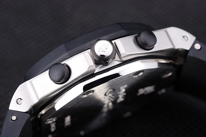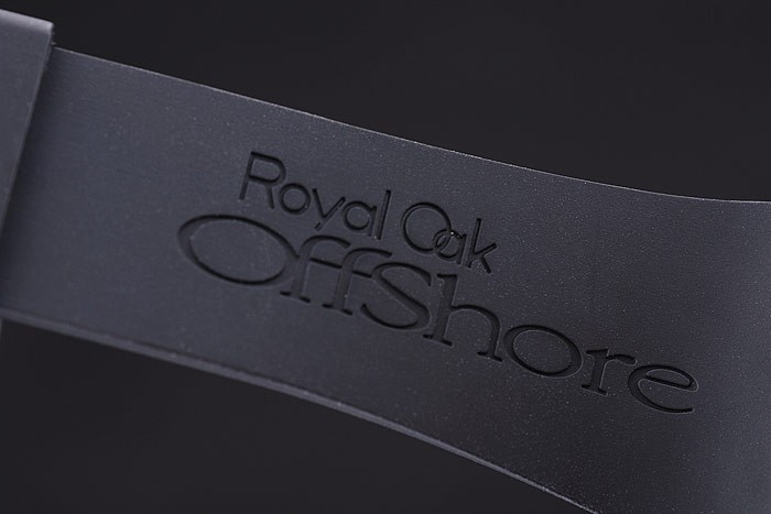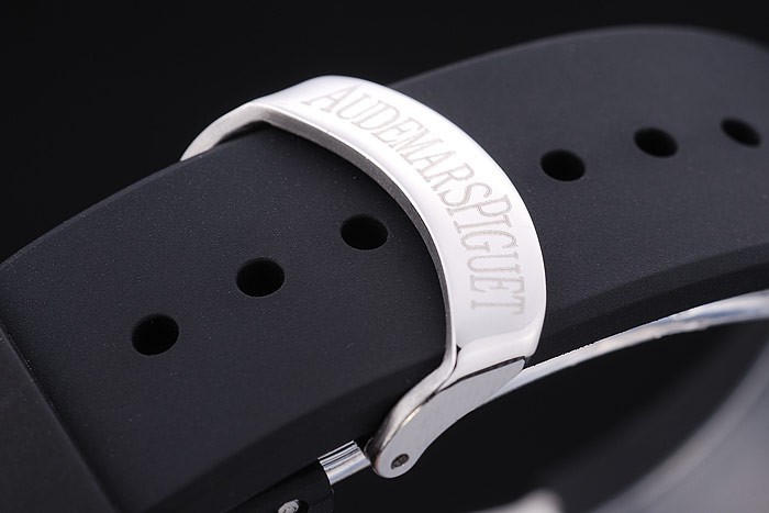 Bracelet: Zwarte rubberen band met warmte reli f Audemars Piguet Royal Oak Offshore stempel en een Audemars Piguet ingeschreven roestvrij stalen flip-over hook clasp