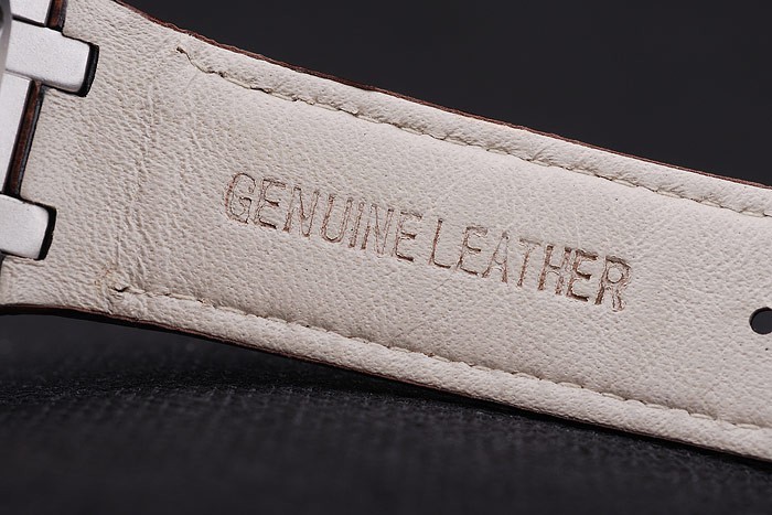 Bracelet: Brown krokodil lederen band met witte draad stiksels en ge mbossed Audemars Piguet naam en het logo en een Audemars Piguet ingeschreven roestvrij staal flip-over hook clasp
