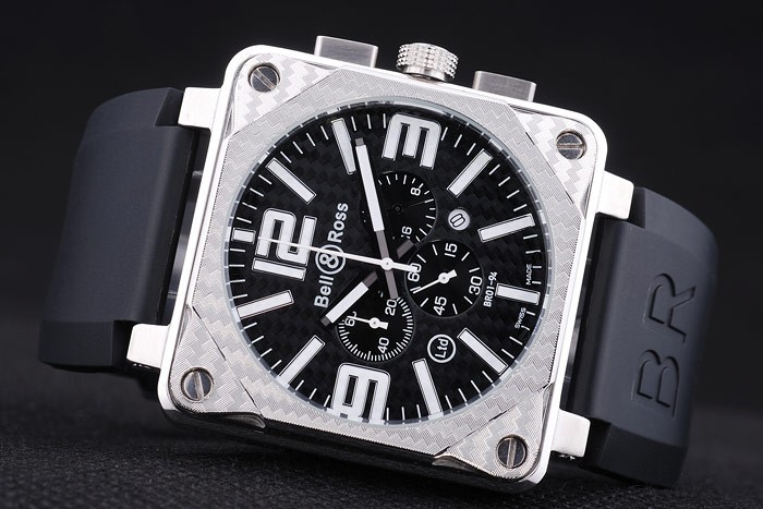 Bracelet: Heat reli f Bell&Ross logo en product code zwarte rubberen band met BR ingeschreven geborsteld roestvrij staal hook-gesp clasp