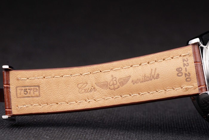 Bracelet: Brown krokodil lederen band met patent witte stiksels en warmte reli f Breitling gravures en gegraveerd roestvrij staal vouwen sluiting met Breitling logo op top