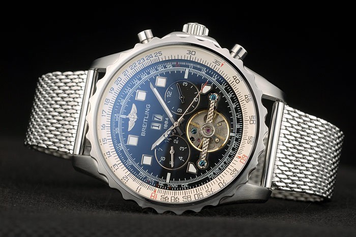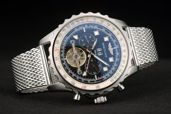 Crown: gepolijst roestvrij staal cutwork kroon met Breitling logo en twee kleine ronde drukknop kronen aan weerszijden van it