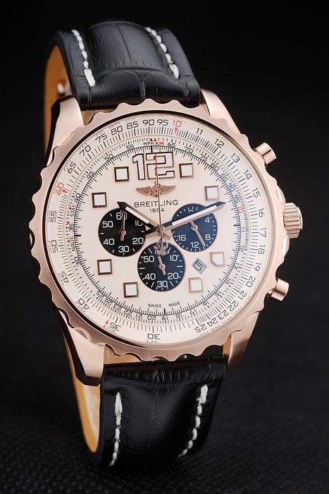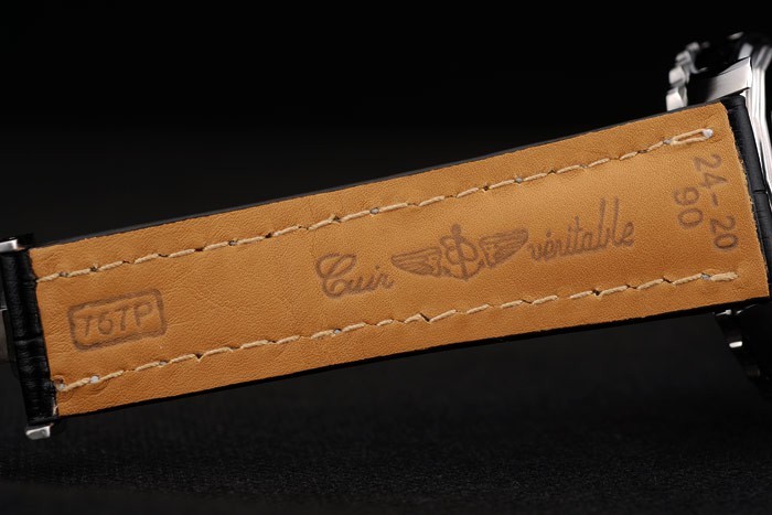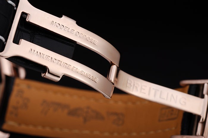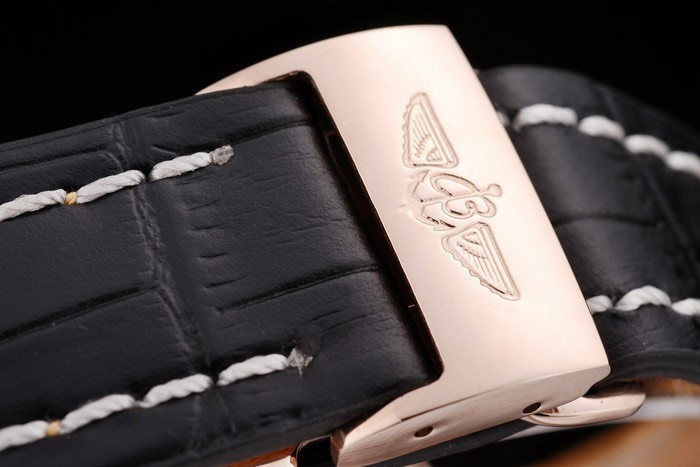 Bracelet: Heat reli f Breitling naam en het logo zwarte krokodillenleren band met witte draad stiching en gegraveerd logo rose vergulde opvouwen in clasp