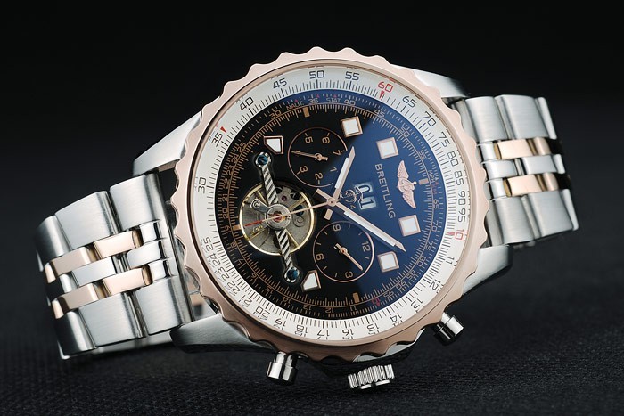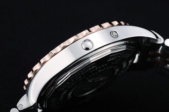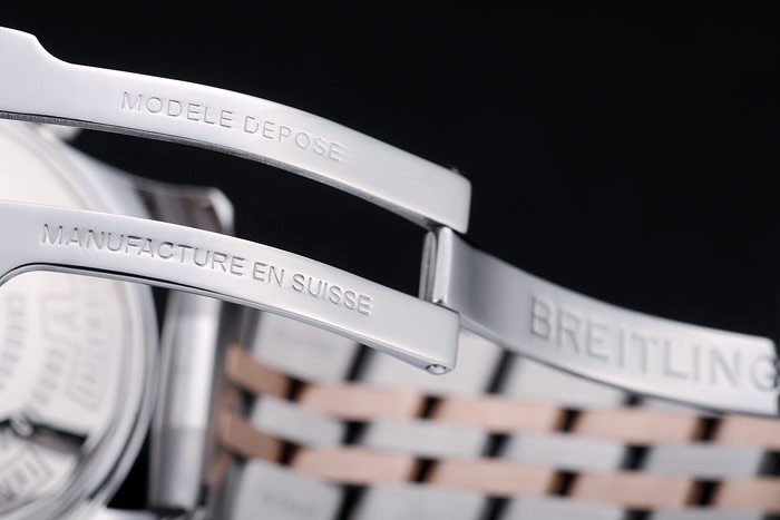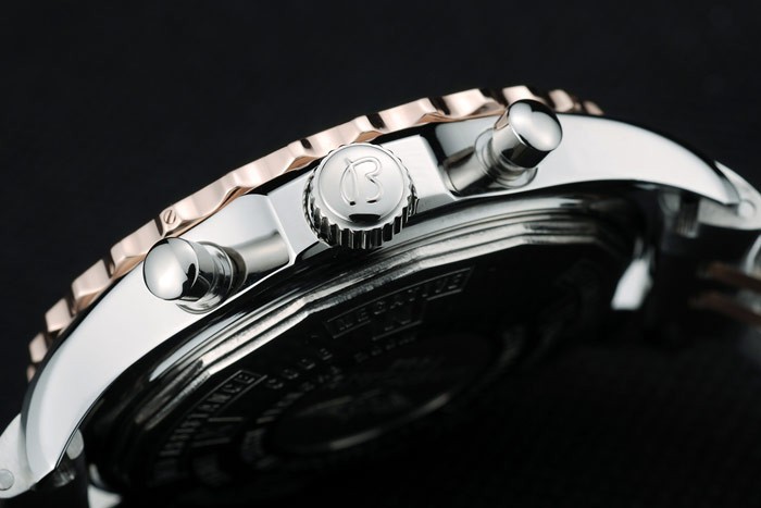 Crown: gepolijst roestvrij staal cutwork kroon met Breitling logo en twee kleinere RVS drukknop kronen aan weerszijden van it