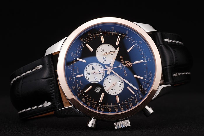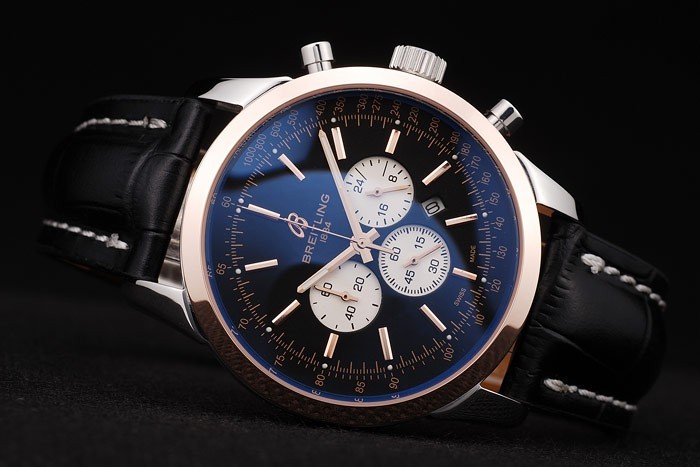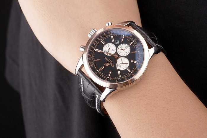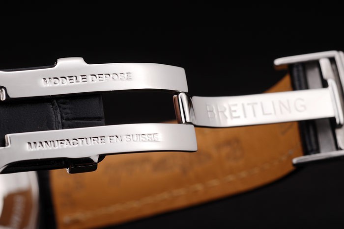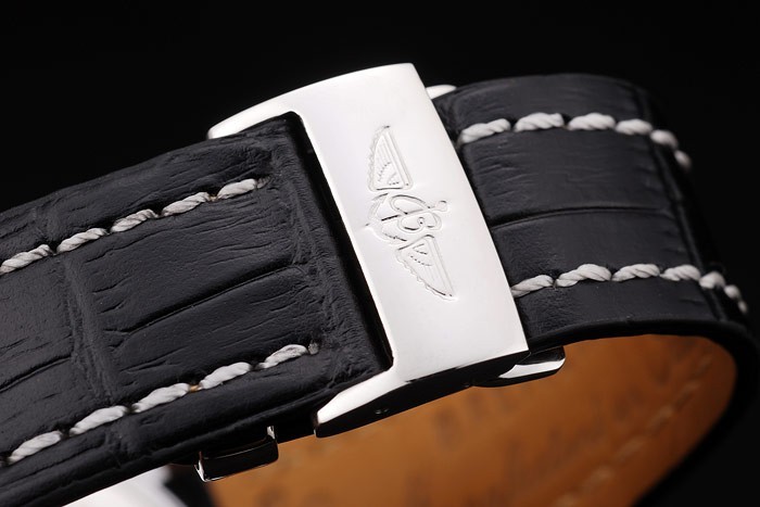 Bracelet: Heat embossed Breitling zwart krokodillenleer riem met witte draad stiksels en een Breitling logo gegraveerd roestvrij staal fold-in clasp