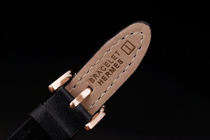 Bracelet: Verlengde zwart lederen band met warmte reli f stempel en Hermes Hermes Bracelet gegraveerd rose vergulde hook-gespsluiting