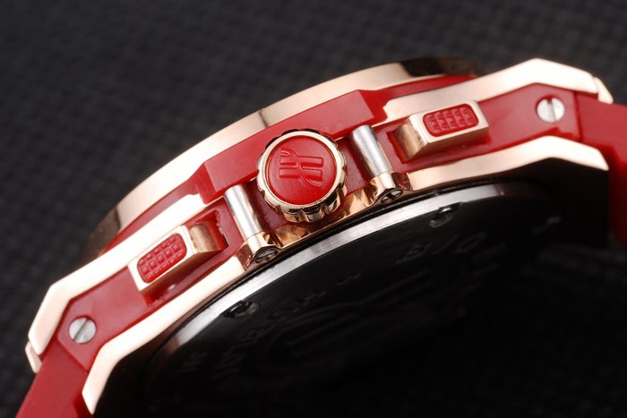 Crown: Cutwork rose-gouden kroon met ‘H’ graveren en twee rechthoekige drukknop kronen aan weerszijden , alle bezaaid met rode rubber trimmings