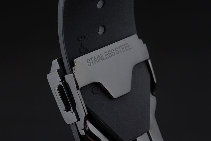 Bracelet: Hublot Geneve ge mbossed geribbelde zwarte rubberen band met Hublot Geneve gegraveerde-ion-plated push vrijlating haak clasp