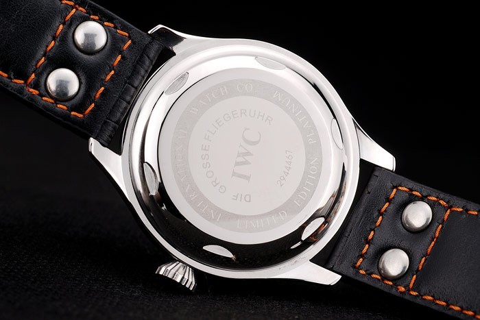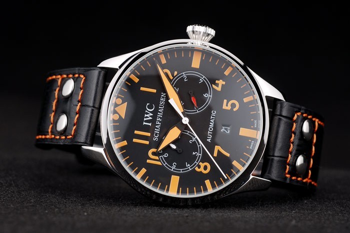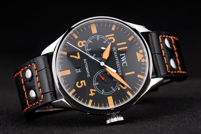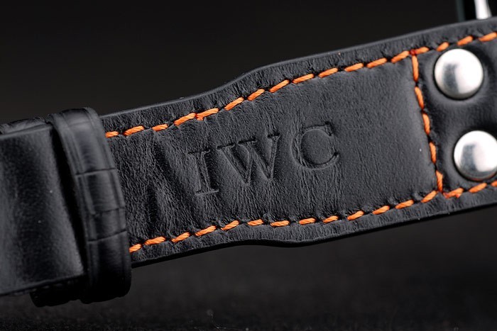 Bracelet: IWC ge mbossed zwarte krokodillenleren band met oranje stiksels draad en gegraveerd geborsteld roestvrij stalen haak-IWC clasp