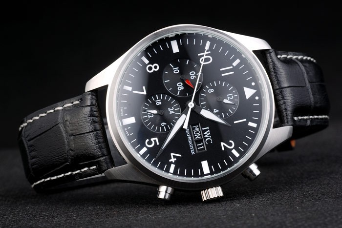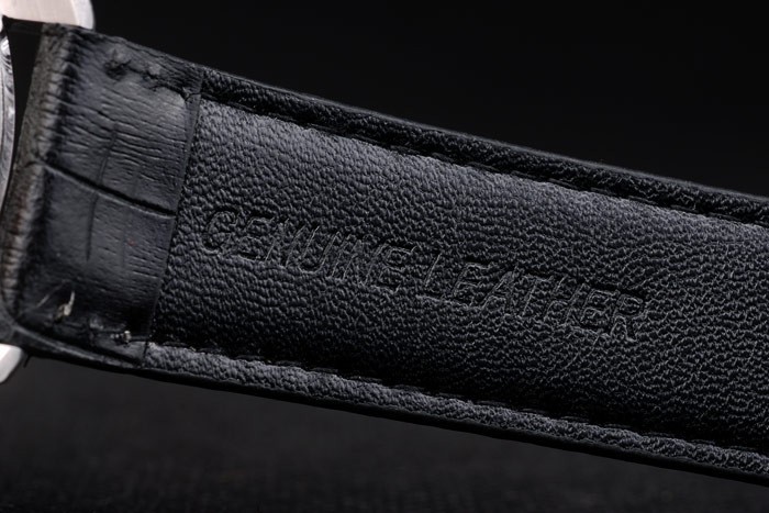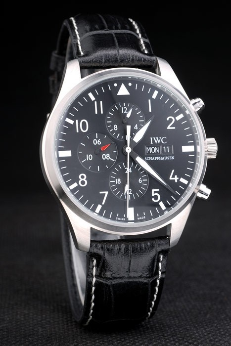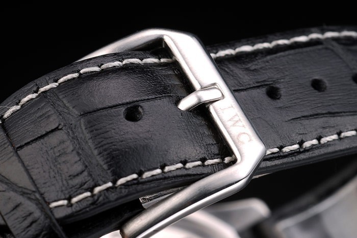 Bracelet: IWC Schaffhausen ge mbossed zwarte krokodillenleren band met witte draad stiksels en IWC ingeschreven roestvrij stalen haak-gesp clasp