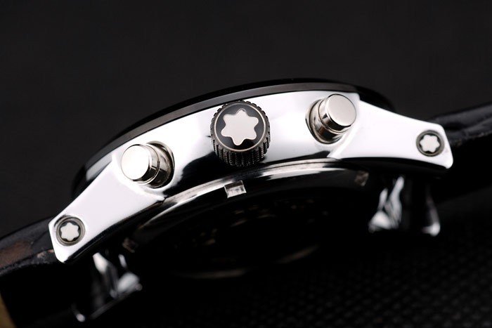 Crown: Ion-plated cutwork kroon met MontBlanc logo en twee gepolijst roestvrij staal drukknop kronen aan beide kant van it