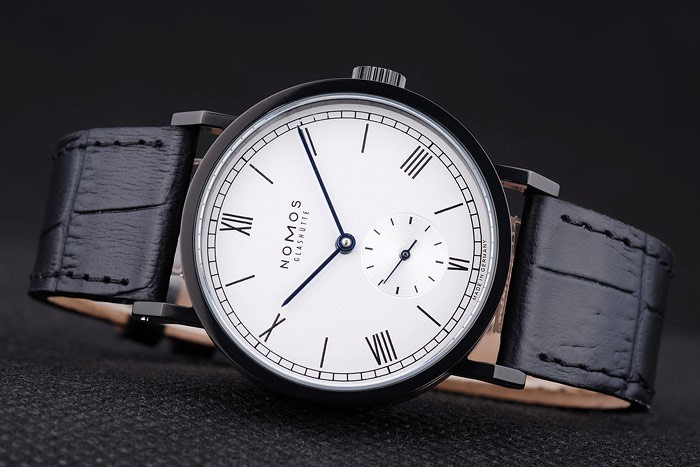 Crown: NOMOS gegraveerd-ion-plated cutwork bezel