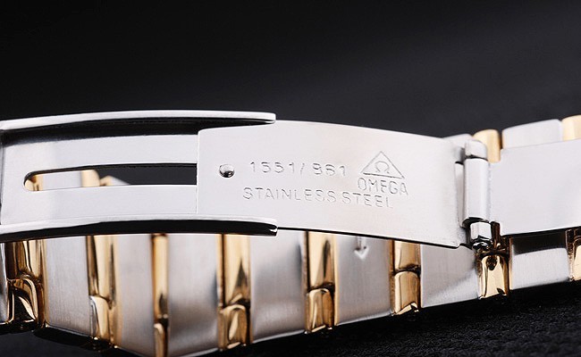 Bracelet: 18k geel goud verguld en geborsteld roestvrij stalen schakelarmband met Omega inscriptie fold-in clasp