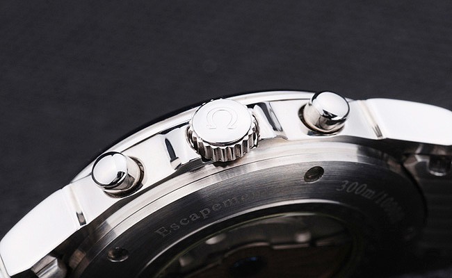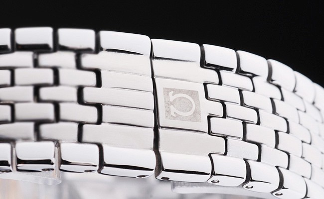 Crown: gepolijst roestvrij staal cutwork kroon met Omega logo plus twee extra kronen, één aan weerszijden van it