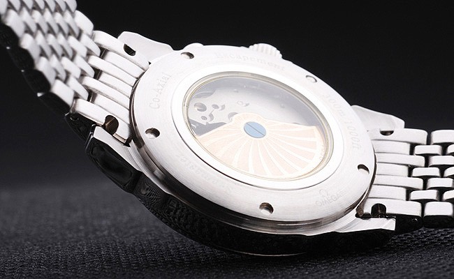 Back: Roestvrij staal push-in zaak terug met Omega inscripties en transparante centrum blijkt dat de monteurs within