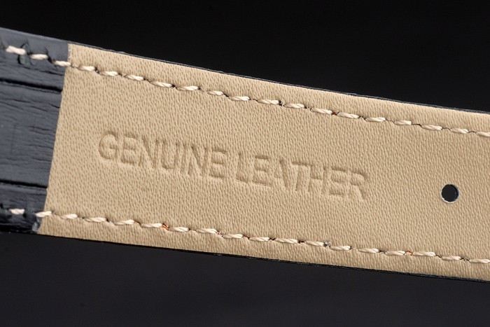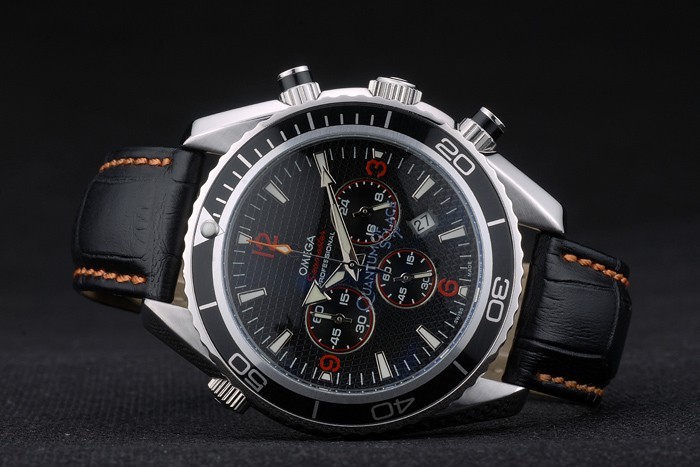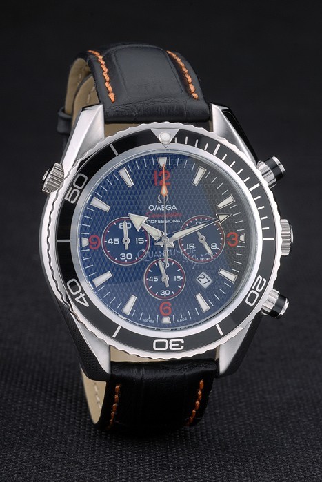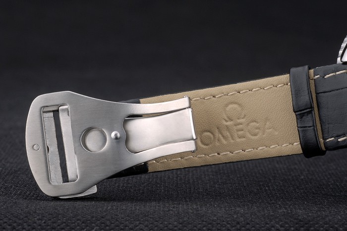 Bracelet: Oranje gestikt zwart lederen band met warmte reli f Omega stempel en gepolijst roestvrij staal fold-in sluiting met Omega logo op top