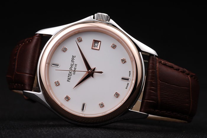 Bracelet: Brown krokodil lederen band met warmte reli f Patek Philippe stempel en 18k rose vergulde haak -buckle sluiting met Patek Philippe engraving