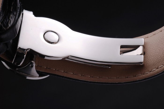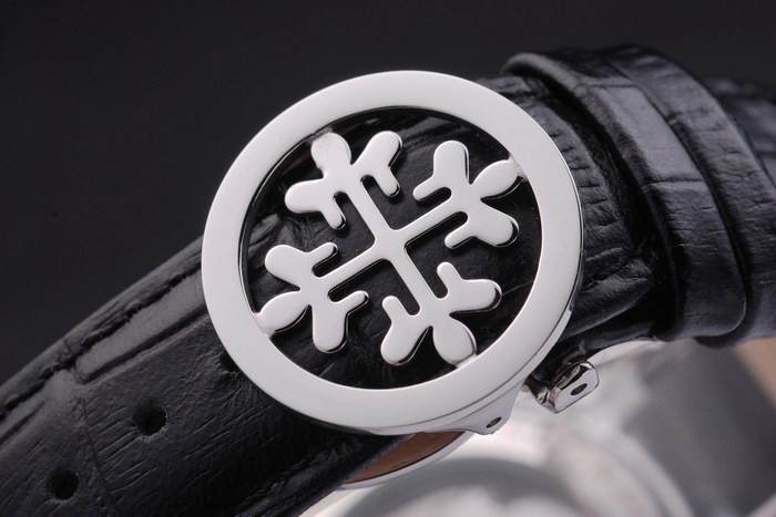 Bracelet: Zwart lederen band met Patek Philippe stempel en een roestvrij stalen vouw in sluiting met Patek logo buckle