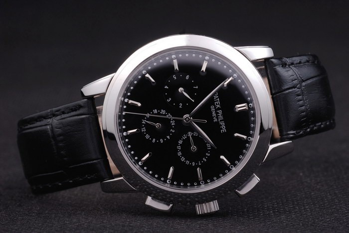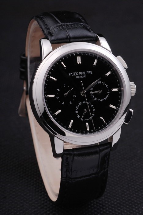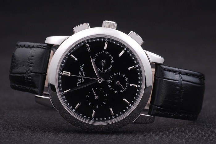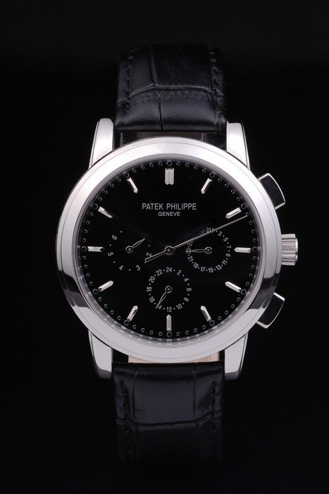 Bracelet: Zwart lederen band met Patek Philippe stempel en een roestvrij stalen vouw in clasp