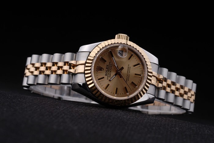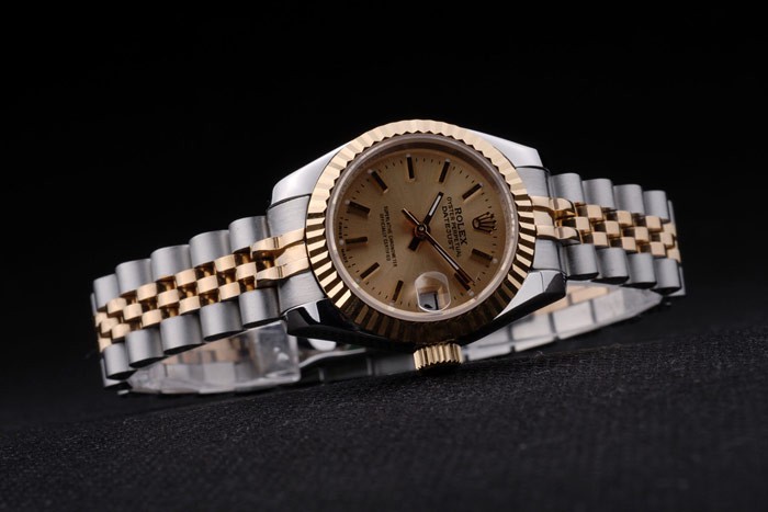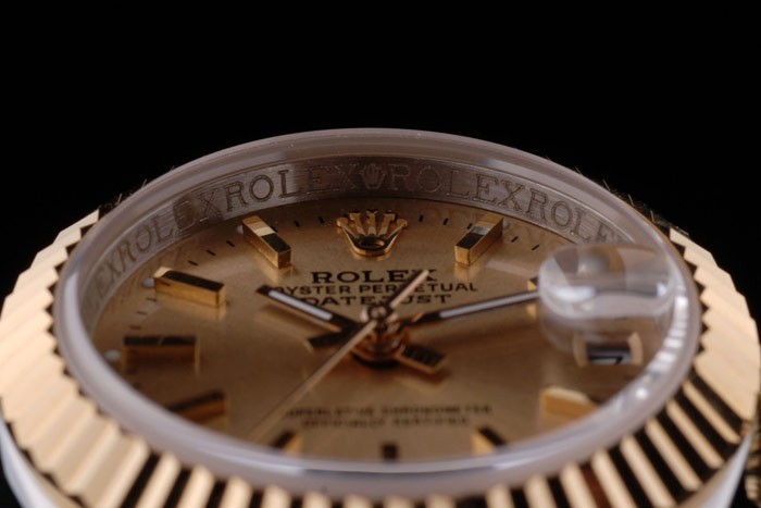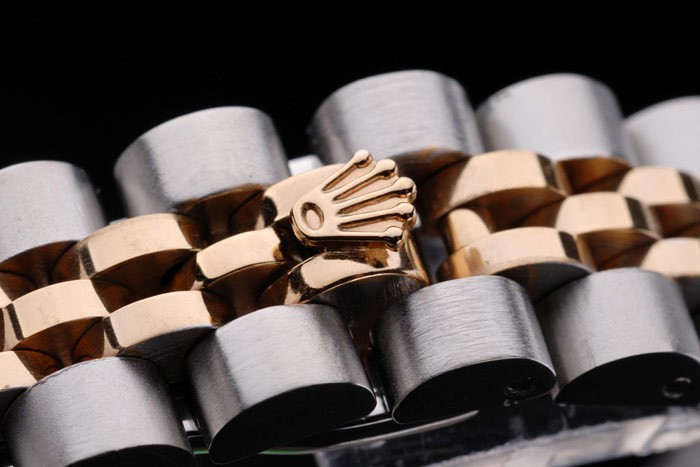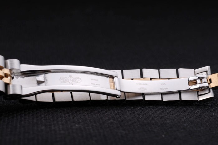 Bracelet: Twee gestemde schakelarmband van gepolijst roestvrij staal en 18k geel goud verguld staal met Rolex gravure verborgen slotje het weergeven van de Rolex logo