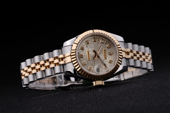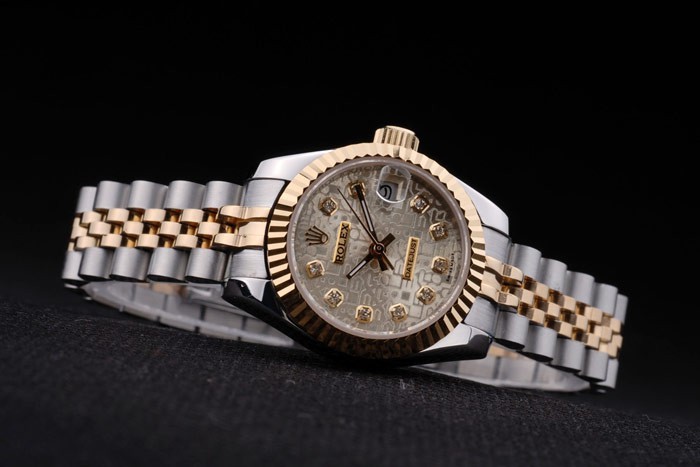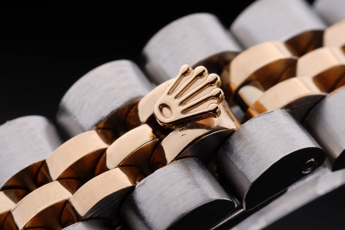 Bracelet: Twee gestemde schakelarmband van gepolijst roestvrij staal en 18k geel goud verguld staal met Rolex gravure verborgen slotje het weergeven van de Rolex logo