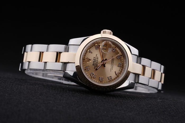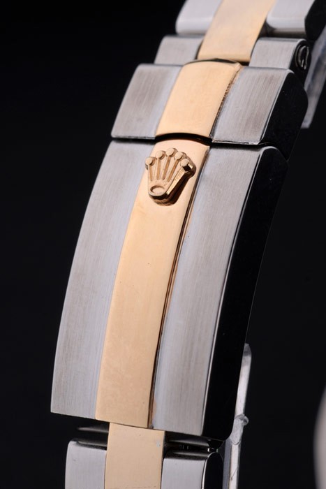 Bracelet: Twee gestemde triple schakelarmband van gepolijst roestvrij staal en 18k geel goud verguld staal met Rolex gravure vouw -in inzet sluiting weergeven van de Rolex logo