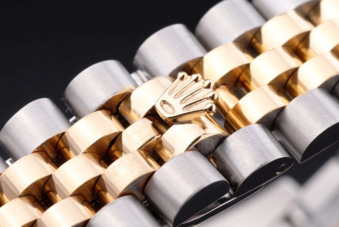 Bracelet: Twee gestemde schakelarmband van gepolijst roestvrij staal en 18k geel goud verguld staal met Rolex gravure verborgen slotje het weergeven van de Rolex logo
