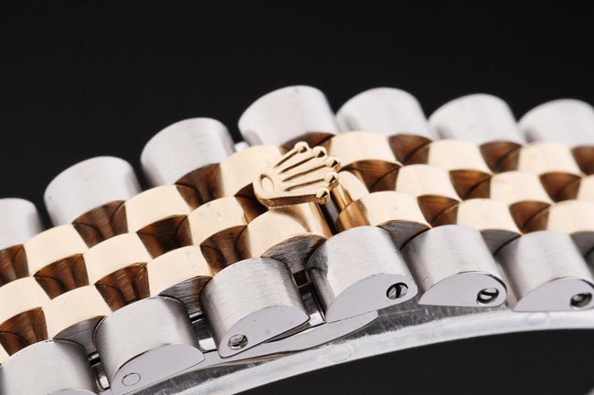 Bracelet: geborsteld roestvrij staal en geel gouden kettingen met vouw over sluiting en Rolex kroon engraving