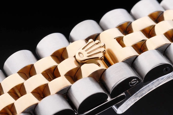 Bracelet: Twee gestemde schakelarmband in geborsteld roestvrij staal en 18k geel goud verguld staal met Rolex gravure verborgen slotje het weergeven van de Rolex logo