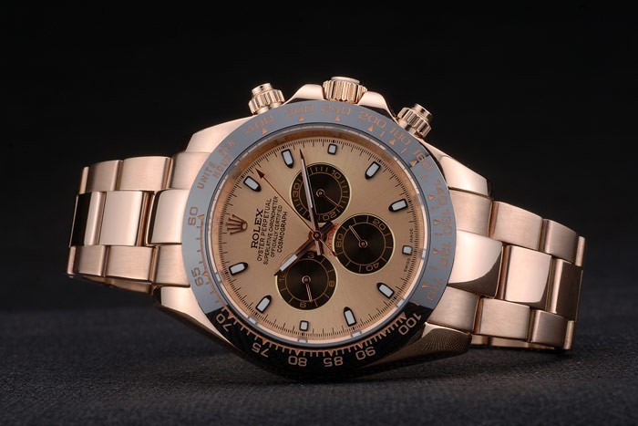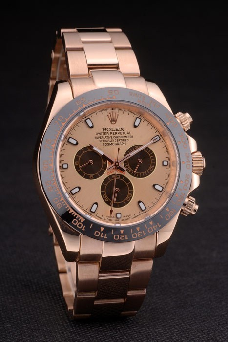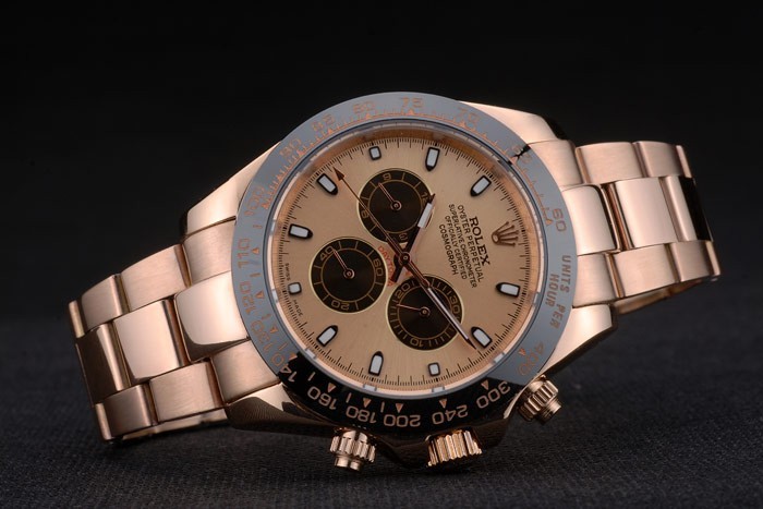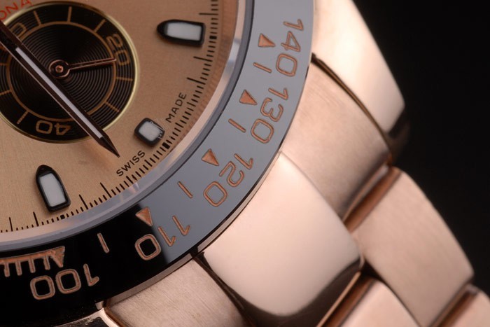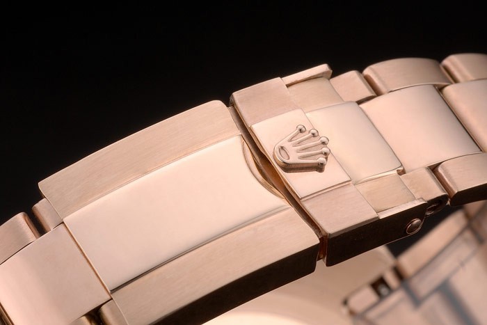 Crown: 18k rose vergulde cutwork kroon met Rolex-logo en een drukknop kroon aan weerszijden van it