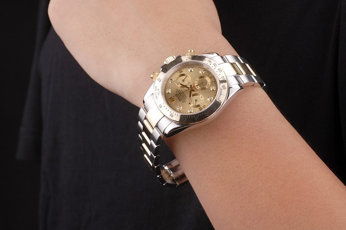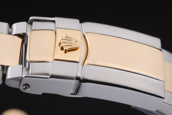 Bracelet: Twee gestemde geborsteld en goud toon roestvrij stalen schakelarmband met Rolex gravure inzet sluiting weergeven van de Rolex logo