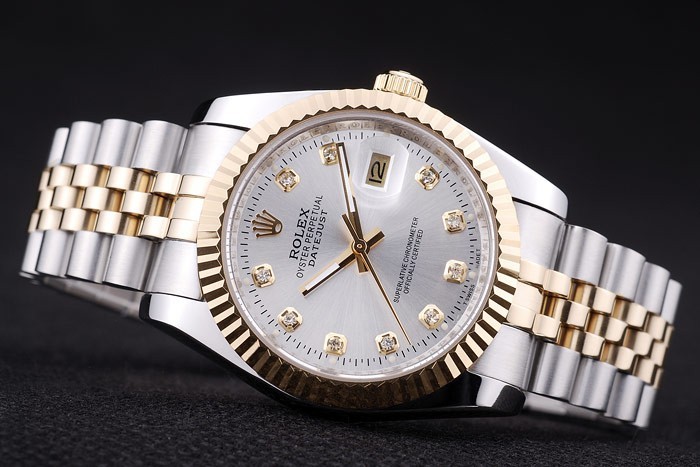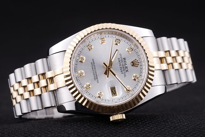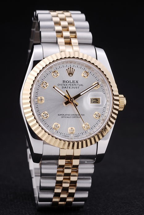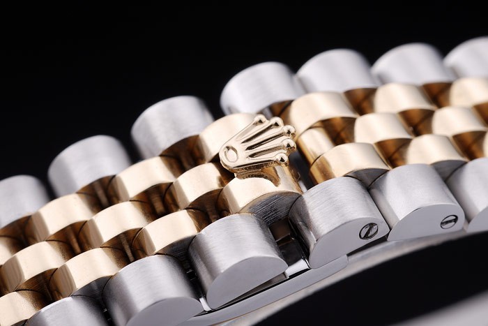 Bracelet: geborsteld roestvrij staal en geel goud schakelarmband met Rolex logo verborgen clasp