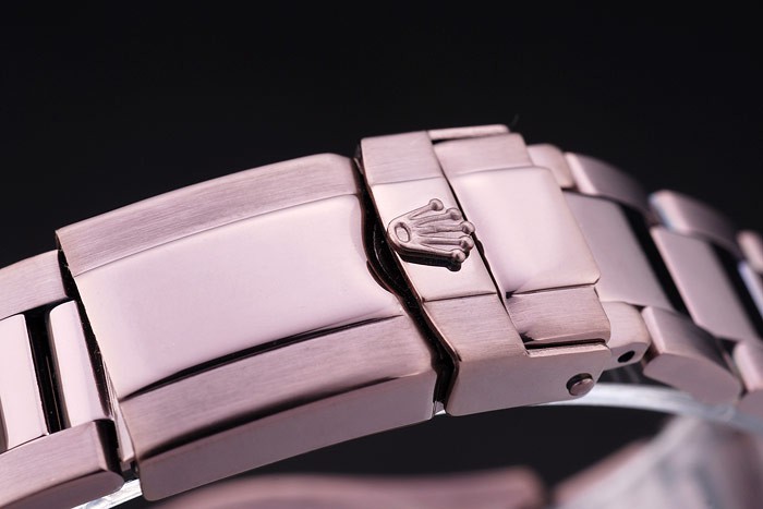 Bracelet: Rosy bruin poedercoating geborsteld roestvrij stalen schakelarmband met Rolex logo inzet clasp