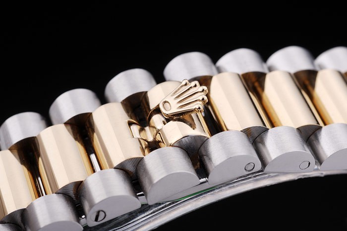 Bracelet: geborsteld roestvrij staal en geel goud schakelarmband met Rolex logo verborgen clasp