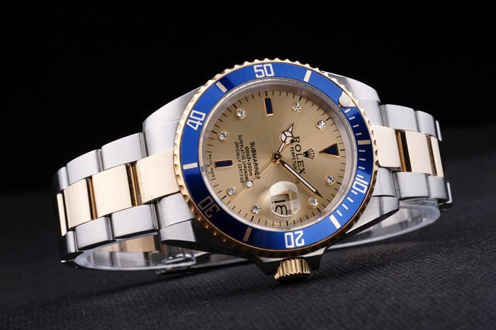 Bezel: Gold-tone cutwork bezel met lichtgevende blauwe ge mailleerde minuten gemarkeerd top