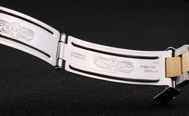 Bracelet: Twee gestemde geborsteld en goud toon roestvrij stalen schakelarmband met Rolex gravure vouwen in de weergave van de gesp Rolex logo