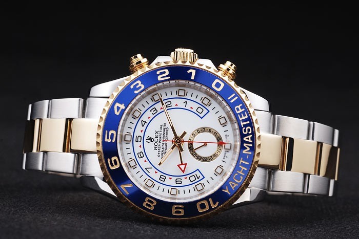 Bezel: Rose goud verguld eenrichtingsverkeer cutwork ring met 1-10 markeringen en Yacht Master graveren op een blauwe ge mailleerde background
