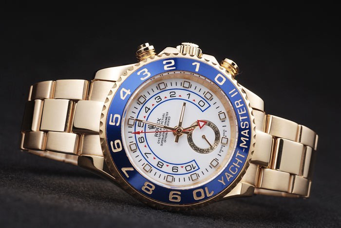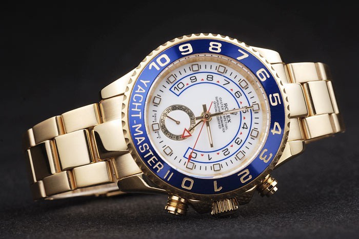 Bezel: Geel verguld eenrichtingsverkeer cutwork ring met 1-10 markeringen en Yacht Master graveren op een blauwe ge mailleerde background