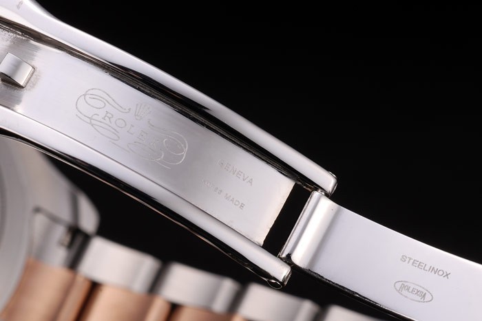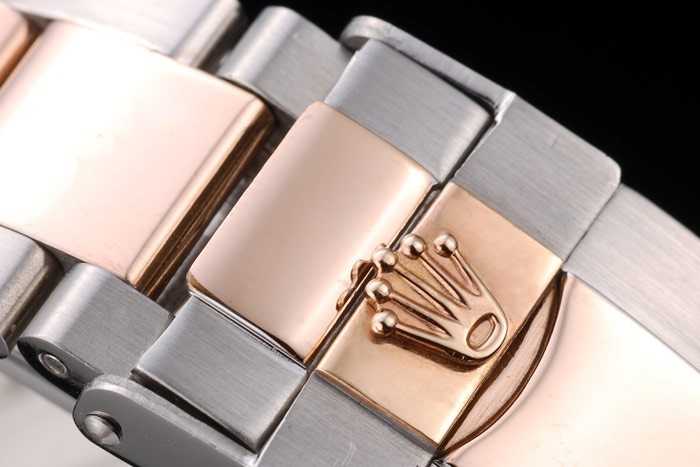Crown: 18k rose-gold cutwork kroon met Rolex-logo en twee kleinere cutwork drukknop kronen aan beide kant van it