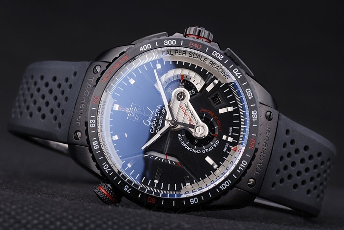 Crown: Ion-plated cutwork kroon met Tag Heuer logo en twee lange cutwork drukknop kronen aan weerszijden daarvan plus een kroon op de tegenoverliggende bovenste corner