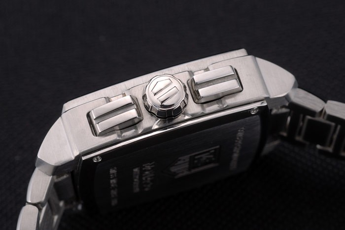 Crown: gepolijst roestvrij staal cutwork kroon met Tag Heuer logo en twee lange cutwork drukknop kronen aan weerszijden van it