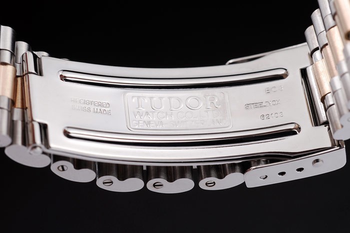 Bracelet: Twee gestemde geborsteld roestvrij staal en geel goud verguld schakelarmband met Tudor gravures en push- vrijgave Vouwsluiting met Tudor-logo op top